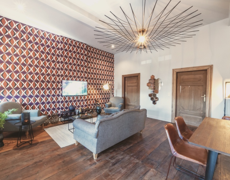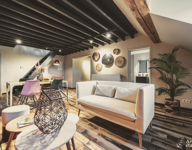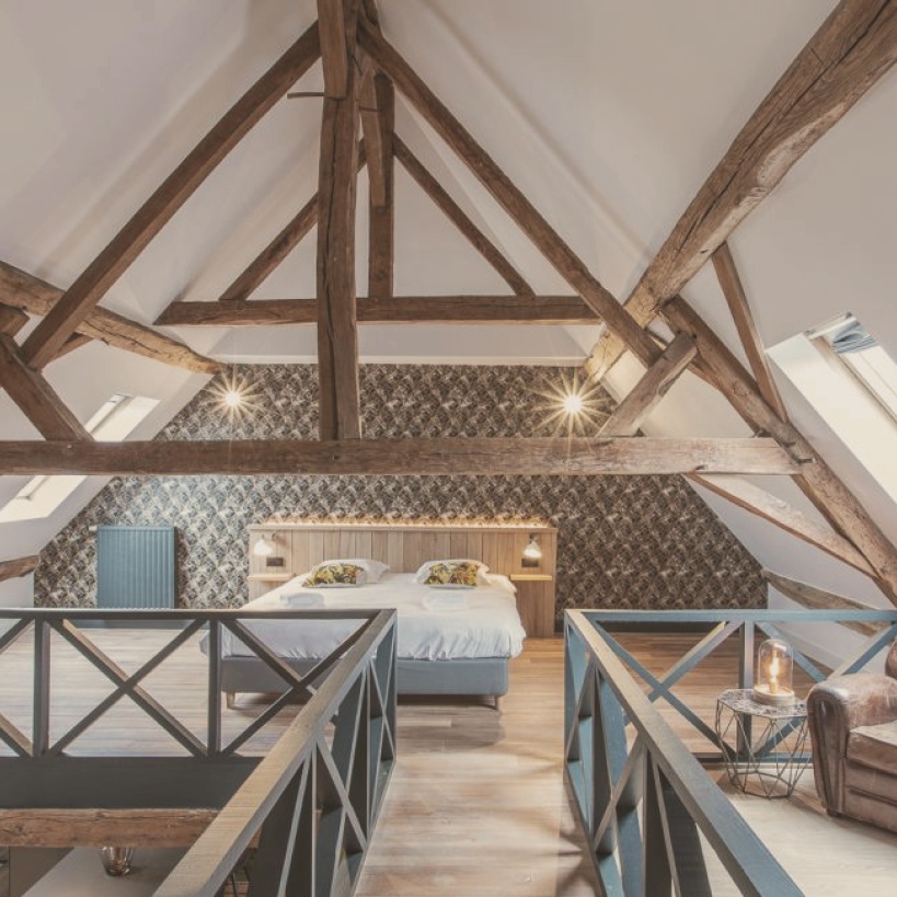 The spirit of this family suite, located in the attic of the main house, evokes a loft atmosphere. Its private wellness area (infrared sauna and hot tub) promises an unforgettable stay.