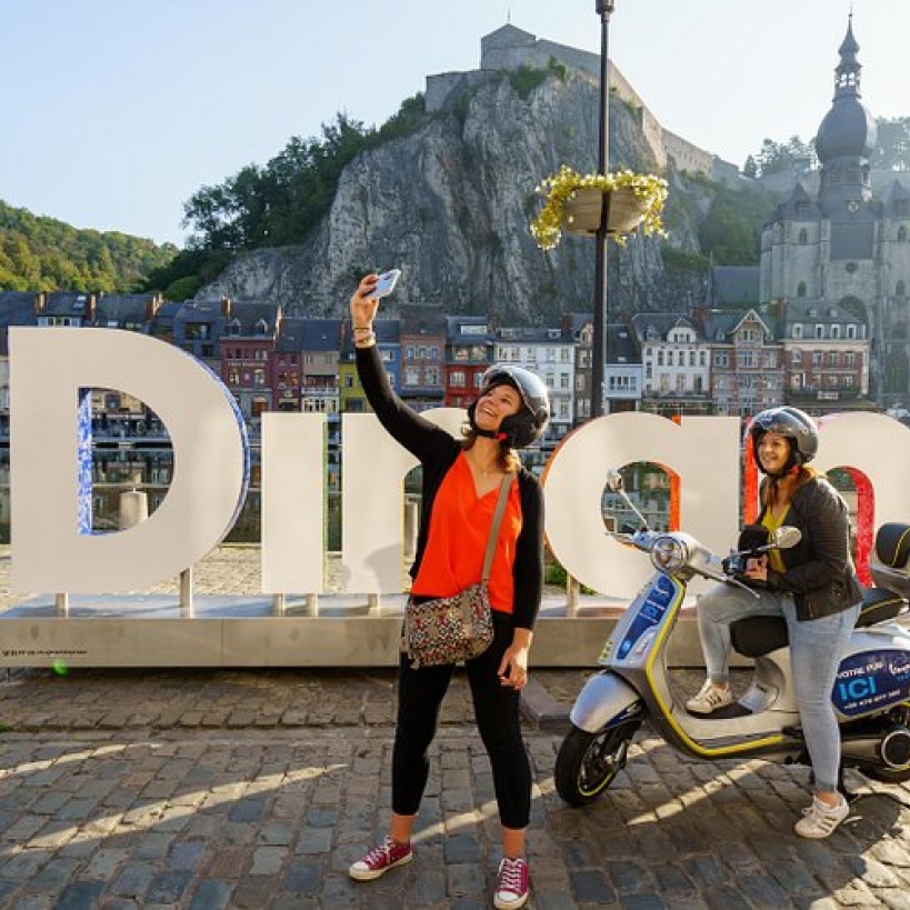 Balade en Vespa électrique sous le soleil d'automne ! Une boucle au départ de Dinant pour profiter de paysages exceptionnels, des sourires, et de beaux moments en famille